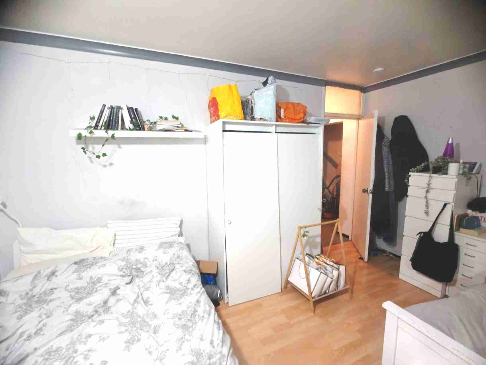 第六层为三间卧室,整体采用中性色调装饰并铺设木地板。其中两间为宽敞的双人卧室,第三间单人间设有内置衣柜。该公寓还设有防火通道。