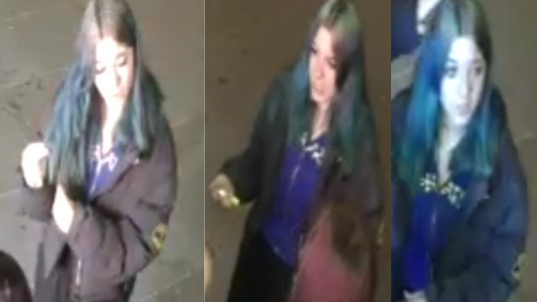 从照片中可以看到,嫌疑人为一名二十多岁的白人女性,留有蓝色长发。案发时身穿深色夹克(左臂带黑色logo)、蓝色连帽衫、黑色裤子以及白色 Crocs 鞋。
