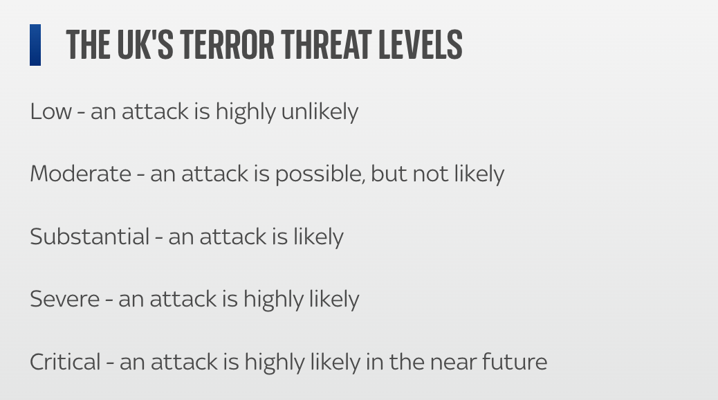 英国当前的恐怖威胁等级为重大(substantial),袭击可能性较高,而且目前本土威胁等级正在紧急重新评估,不排除升级的可能。