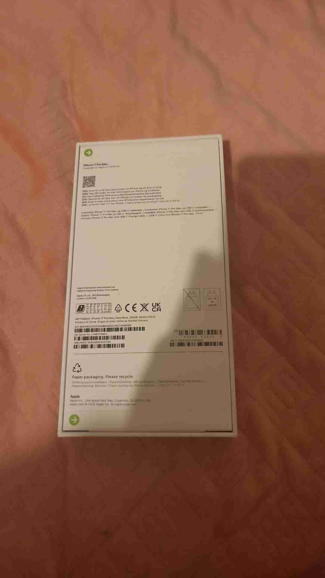 全新苹果手机 iPhone 17 Pro Max 256GB 8折出售。 朋友送的礼物,自己用不上,就转了 。 960 镑出。 蓝色。 不议价 。 非诚勿扰。 07419199762。