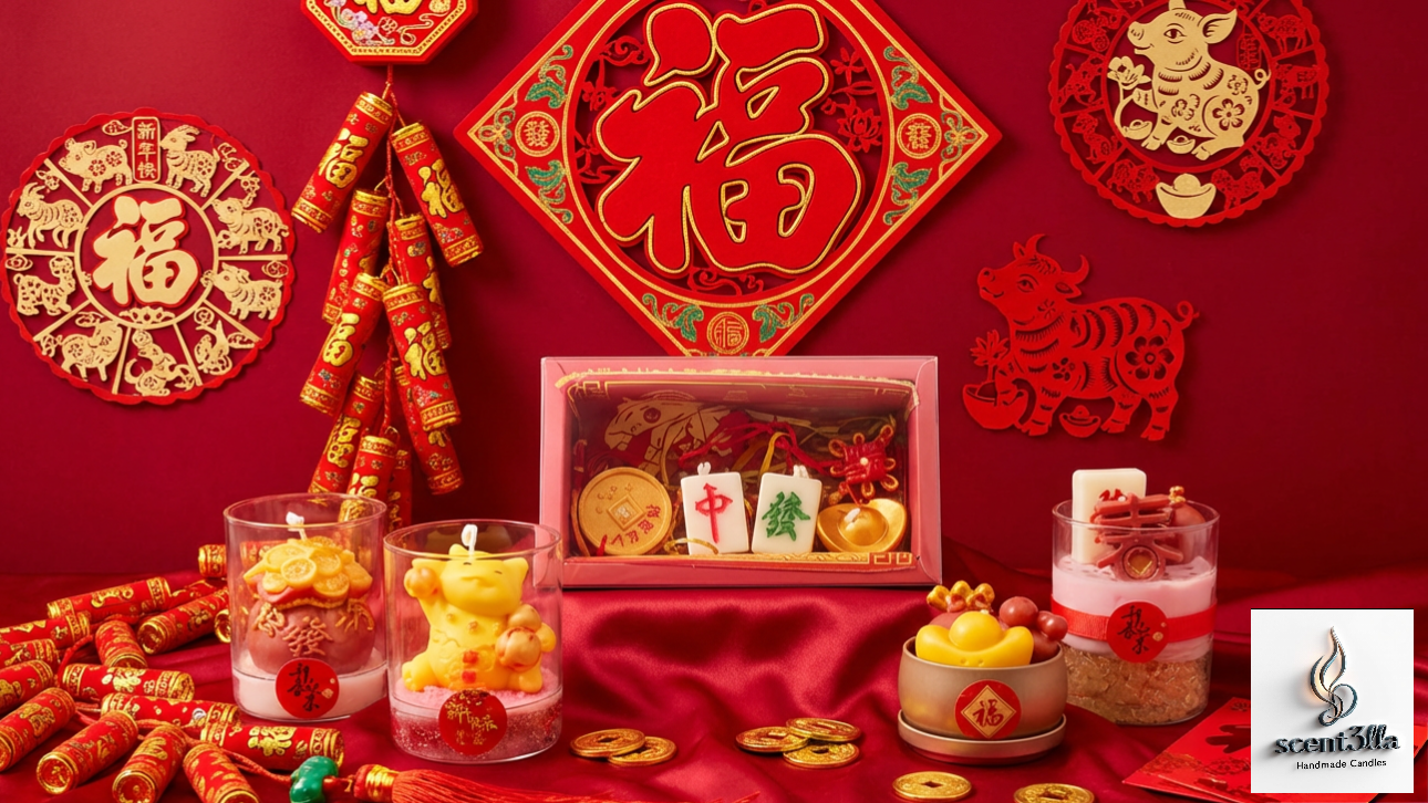 Beautiful and unique Lunar New Year Prosperity" candle gift set.