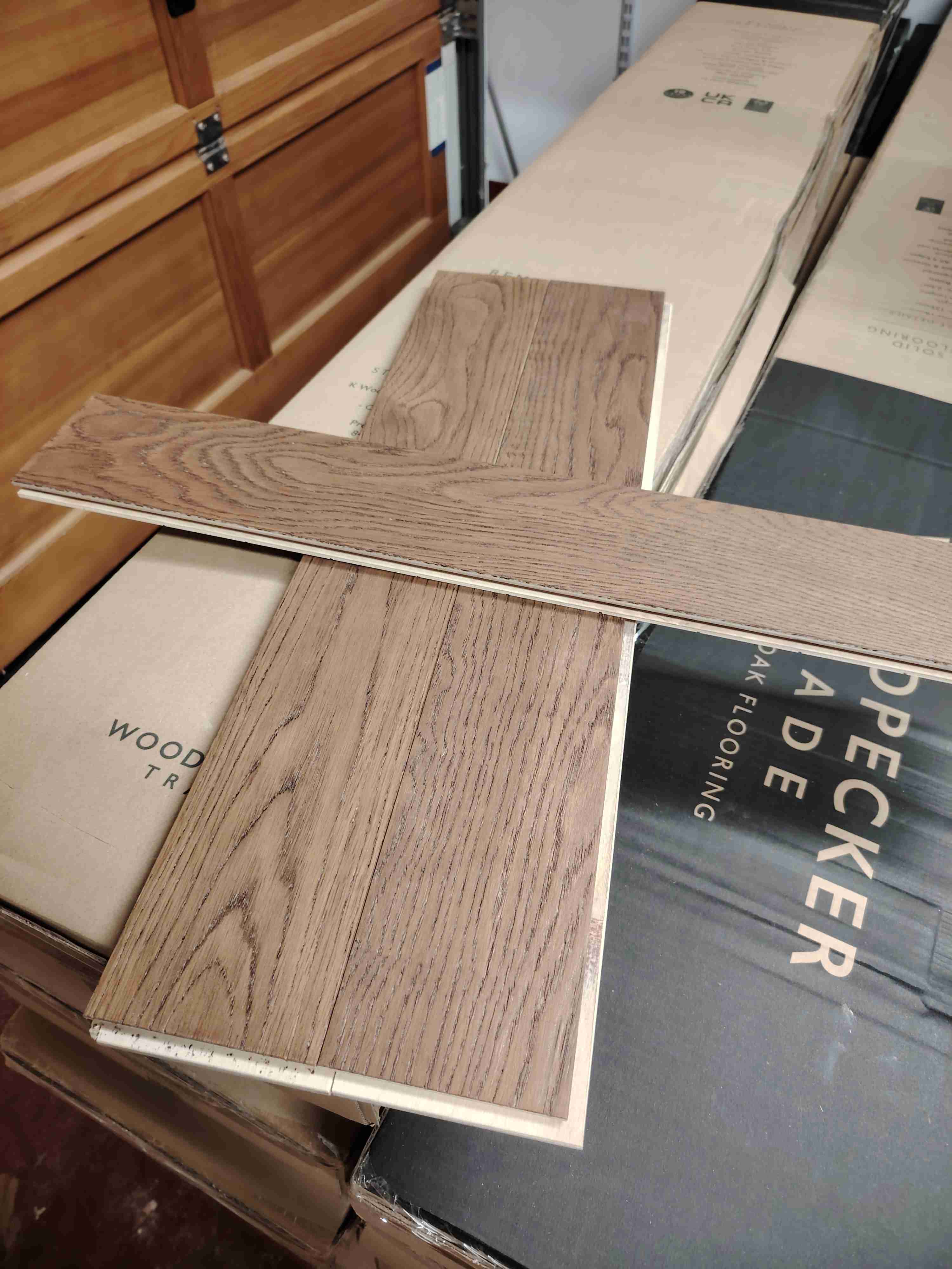 因房屋装修购买过多,现低价出售220平方橡木人字拼木地板,可分购。