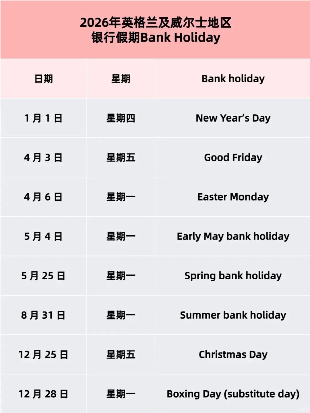 2026英格兰及威尔士地区银行假期Bank Holiday