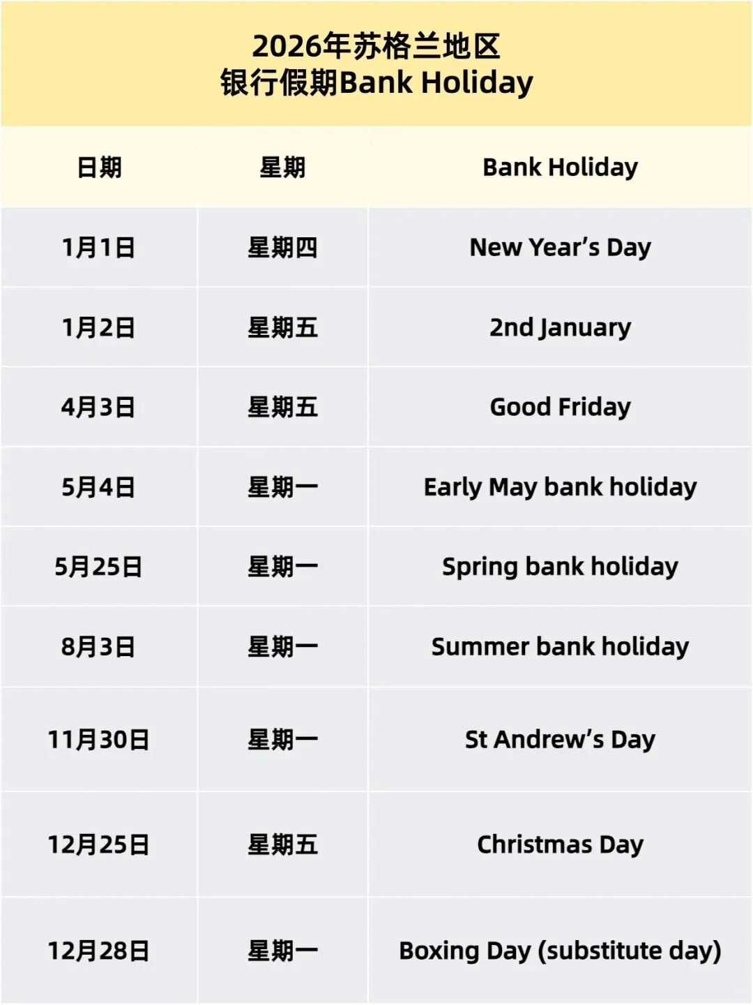 2026苏格兰地区银行假期Bank Holiday